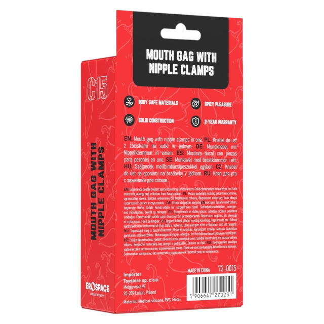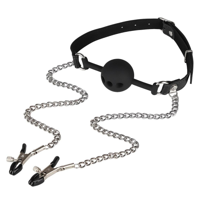 Кляп виконаний з медичного силікону та ПВХ, затискачі – з металу, що забезпечує безпечне використання та довговічність. Надійна конструкція дозволяє продукту витримувати активні ігри, а регульовані затискачі дають можливість контролювати силу тиску, варіюючи інтенсивність стимуляції за вашими уподобаннями.