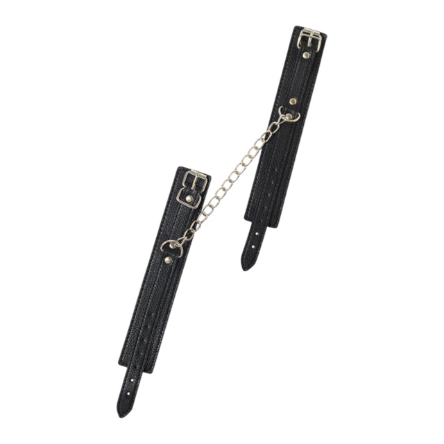 Наручники виготовлені з довговічного PVC і металу, завдяки чому вони зберігають форму, не деформуються та витримують активне використання. М'який внутрішній бік забезпечує комфорт на шкірі, а ремінці з надійними застібками дають змогу точно припасувати розмір під зап'ястки. Металеві карабіни відкривають безліч варіантів фіксації — як спереду, так і за спиною, що дає простір для фантазії та різних сценаріїв гри.