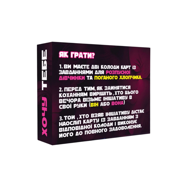 Ця еротична гра для пар створена для того, щоб відкрити нові горизонти в інтимному житті, краще зрозуміти бажання один одного та посилити емоційну та фізичну близькість. Формат гри допомагає легко говорити про фантазія, проявляти ініціативу та додавати пристрасть у відносини, перетворюючи кожен вечір на особливу пригоду.